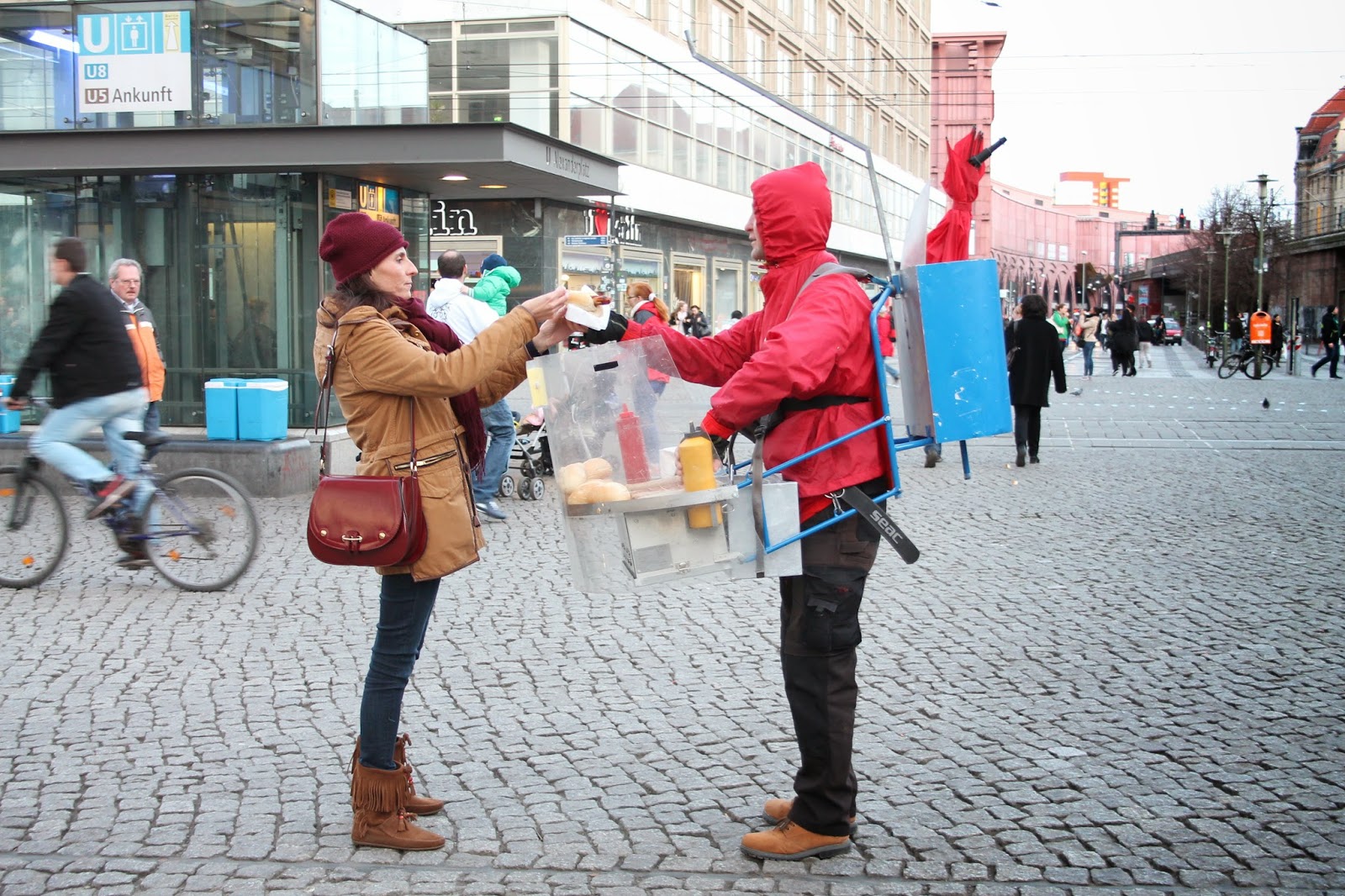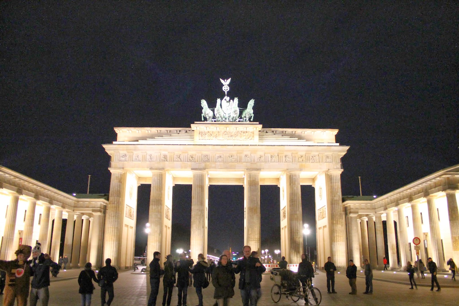 Pues como os decía, en la toma de contacto cruzamos el río SPREE que recorre toda la ciudad, paseamos por ALEXANDER PLATZ, donde vimos el famoso reloj y la torre de televisión y nos comimos unas salchichas de las que venden en la calle (buenísimas y baratísimas). Seguimos por el barrio judío con la NUEVA SINAGOGA, por HACKESCHER MARKT con sus animados puestos de comida y artesanía, por las calles comerciales de FRIEDRICH y UNTER DEN LINDEN y llegamos a la puerta de BRANDENBURGO.